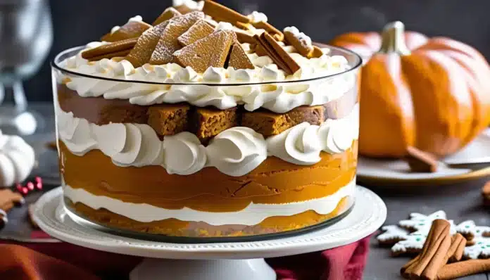 - In a large trifle dish or individual serving glasses, layer the gingerbread cake cubes, followed by a layer of pumpkin filling, and then a layer of whipped cream. Repeat the layers until all ingredients are used, finishing with a layer of whipped cream on top.
