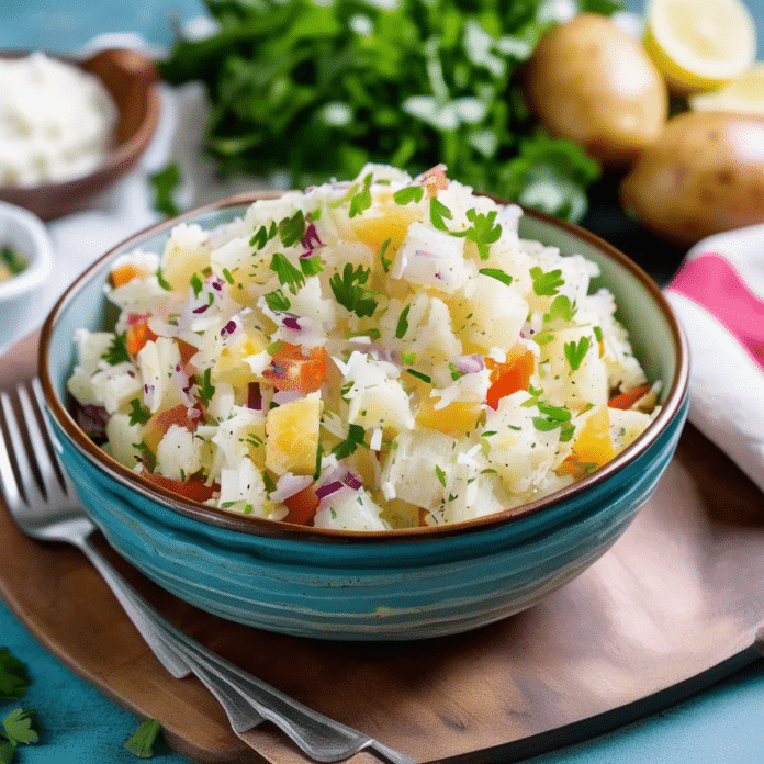 Grated Potato Salad is a fresh and unique take on the traditional potato salad, offering a delightful twist with its finely grated potatoes that provide a lighter, fluffier texture. This salad is mixed with crisp vegetables and tossed in a tangy, creamy dressing, making it a perfect side dish for barbecues, picnics, or any casual gathering. The grated potatoes absorb the flavors of the dressing beautifully, while ingredients like chopped onions, celery, and herbs add a satisfying crunch and brightness to every bite. Easy to prepare and full of flavor, this Grated Potato Salad is sure to be a refreshing addition to your meal rotation.