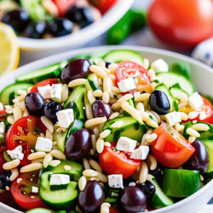 Greek Orzo Salad is a light, refreshing, and flavorful dish that combines the fresh ingredients of a traditional Greek salad with the tender bite of orzo pasta. This colorful salad is packed with juicy tomatoes, crisp cucumbers, tangy Kalamata olives, and feta cheese, all tossed in a zesty lemon-oregano dressing. It’s a perfect side dish for barbecues, picnics, or a healthy lunch on its own. Easy to make and full of Mediterranean flavors, this salad can be enjoyed cold or at room temperature, making it a versatile and crowd-pleasing option for any occasion.