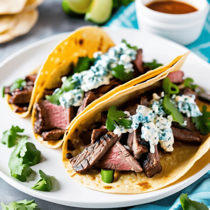 - Garnish and Serve: Sprinkle fresh cilantro leaves over the tacos and serve with lime wedges on the side for squeezing. Enjoy your Grilled Beef and Blue Cheese Tacos immediately!