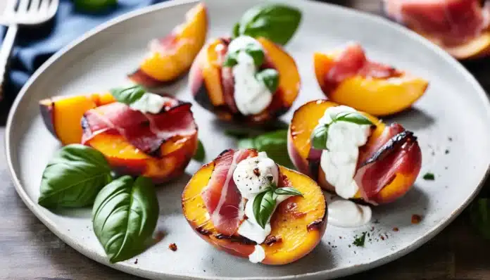 - Assemble the Dish: Arrange the grilled peaches on a serving platter. Add torn pieces of burrata cheese around the peaches.