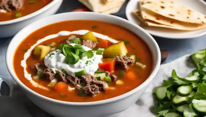 This flavorful Gyro Soup captures the essence of a traditional Greek gyro in a warm, comforting bowl. Combining the savory flavors of seasoned ground lamb (or beef), fresh vegetables, and a rich broth, this soup is topped with a creamy tzatziki-inspired swirl and served with toasted pita chips. It’s a unique twist on a classic dish, perfect for those who love the bold, aromatic spices of Mediterranean cuisine. Whether you’re looking for a hearty lunch or a light dinner, this soup offers all the beloved elements of a gyro in a soul-warming format.