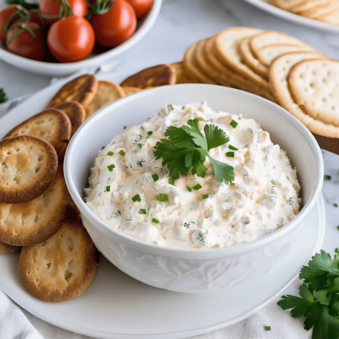 - Before serving, sprinkle the dip with fresh chives or parsley. Serve chilled with crackers, baguette slices, or fresh vegetables.