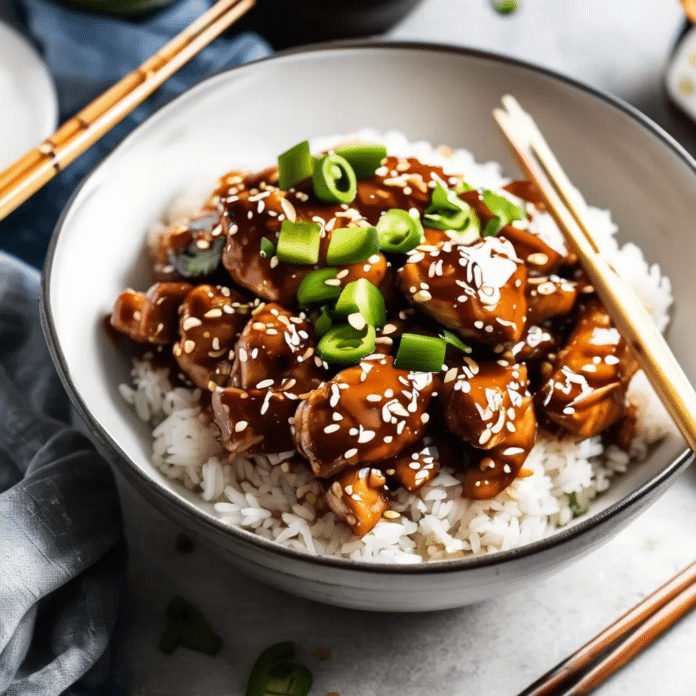 • Return the chicken to the sauce, stir to coat, and serve over rice. Garnish with sesame seeds and green onions.