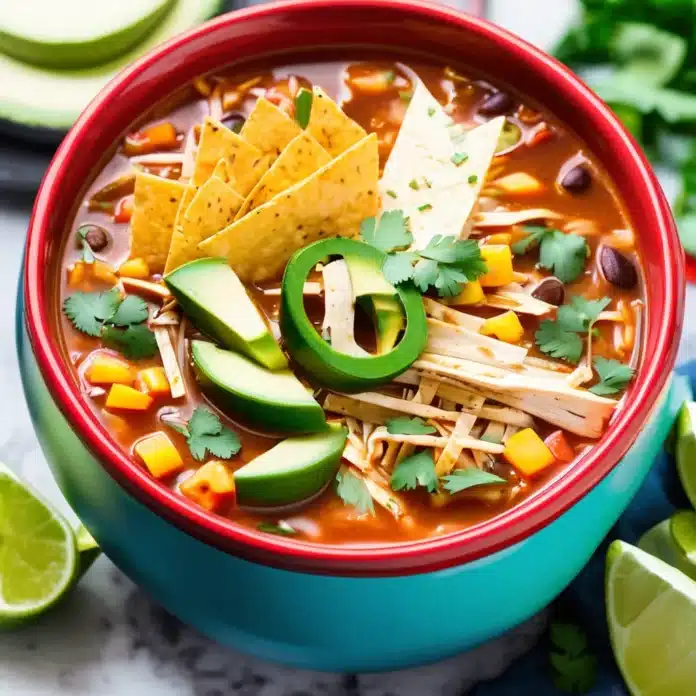 - Serve: Ladle the soup into bowls and garnish with tortilla strips, avocado, shredded cheese, sour cream, and lime wedges as desired. Enjoy your flavorful and hearty Instant Pot Tortilla Soup!