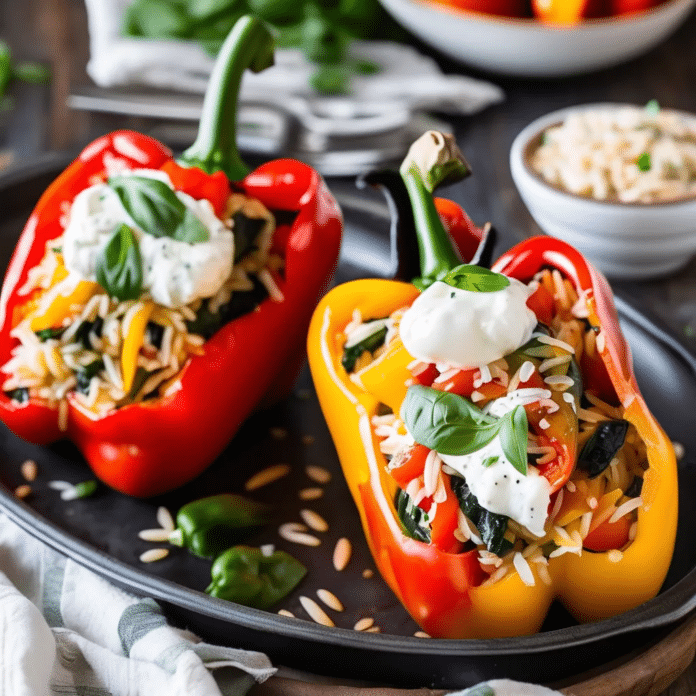 Italian Orzo Stuffed Peppers with Burrata is a fresh and flavorful dish that combines the hearty textures of orzo pasta with the vibrant taste of roasted bell peppers. The orzo is cooked with a savory blend of Italian herbs, tomatoes, and spinach, then stuffed into tender roasted peppers for a delicious and colorful meal. Topping each pepper with creamy, luscious burrata adds a rich, indulgent finish that elevates the dish to a new level of comfort and sophistication. This satisfying yet light meal is perfect for any dinner occasion, offering a beautiful balance of flavors and textures.