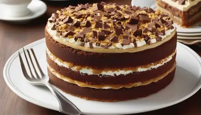 - Decorate the top of the cake with remaining toffee bits and nuts.