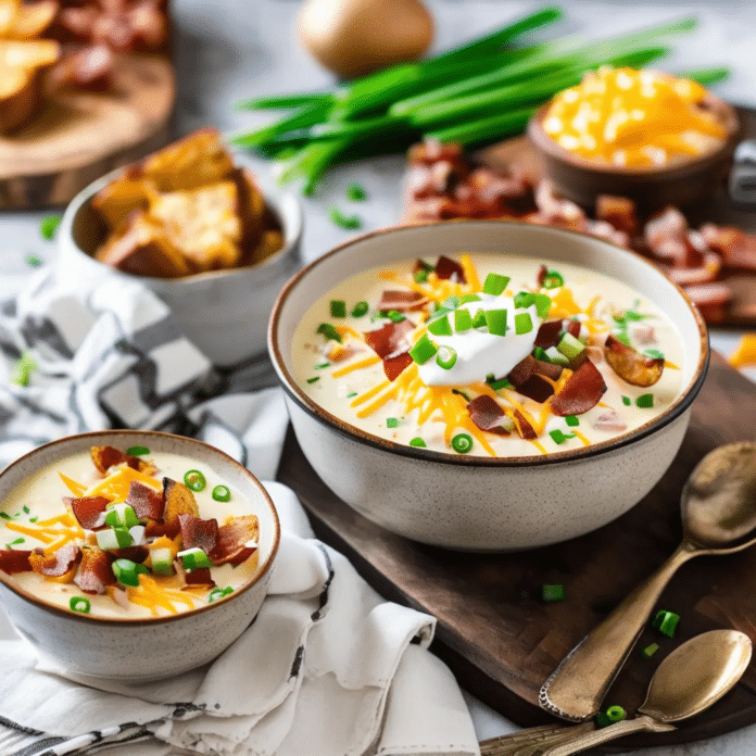 • Season the soup with salt and black pepper to taste. Ladle into bowls and garnish with crispy bacon, green onions, extra cheddar cheese, and a dollop of sour cream.