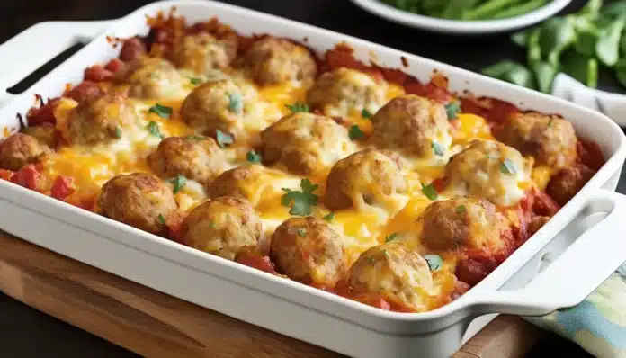 5. Layer the Bake: Spread the hash brown mixture evenly in the prepared baking dish. Arrange the cooked meatballs on top of the hash brown mixture, pressing them down slightly into the mixture.