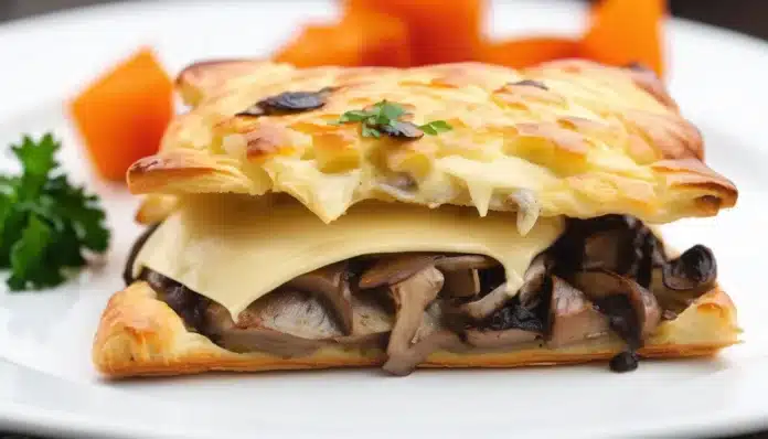 Mushroom and Smoked Gouda Puff is a decadent, savory pastry that’s perfect for entertaining or a special weekend brunch. This golden puff pastry is filled with a rich, creamy mixture of sautéed mushrooms, aromatic herbs, and the smoky, nutty flavor of Gouda cheese. The combination of buttery, flaky pastry and the earthy mushrooms with melted Gouda creates a beautifully textured dish that is both elegant and comforting. Whether served as an appetizer, a side dish, or the main course, this puff is sure to impress with its bold flavors and irresistible presentation.