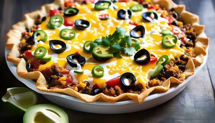 Nacho Pie is the ultimate fusion of comfort food and Tex-Mex flavors, bringing together the best of both worlds in a single dish. Imagine a savory pie crust filled with seasoned ground beef, gooey cheese, and all your favorite nacho toppings, baked to perfection. This dish is perfect for a family dinner or a casual get-together, offering all the deliciousness of nachos in a hearty, satisfying form. The crispy crust adds a delightful contrast to the rich, melty interior, making every bite a delightful experience. Whether you’re a nacho lover or just looking for a fun twist on dinner, Nacho Pie is sure to please.