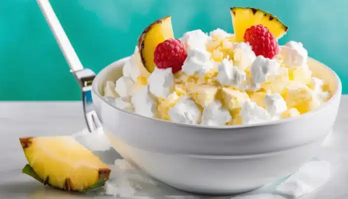 - Serve: Before serving, give the fluff a quick stir. Garnish with maraschino cherries, additional coconut, or pineapple chunks if desired. Serve chilled and enjoy the tropical flavors!