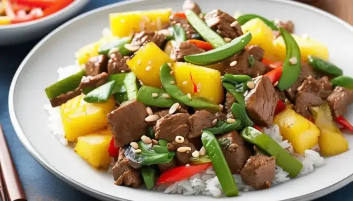 - Add Pineapple and Beef: Stir in the pineapple chunks and return the beef to the skillet. Pour the prepared stir-fry sauce over the mixture and stir everything together. Cook for another 2-3 minutes until the beef is fully cooked and the sauce has thickened slightly.