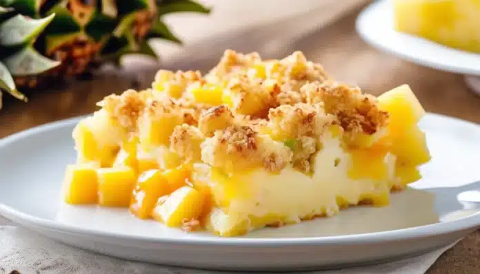 Enjoy your Pineapple Casserole warm as a sweet and savory side dish!
