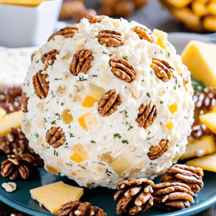 The Pineapple Cheese Ball is a delightful and festive appetizer that combines sweet and savory flavors in one crowd-pleasing bite. This cheese ball is a creamy mixture of cream cheese, pineapple, and nuts, rolled into a charming, retro-shaped ball and coated with a crunchy pecan or walnut crust. It’s the perfect addition to holiday parties, potlucks, or casual get-togethers, offering a refreshing contrast to more traditional savory snacks. Easy to prepare and even easier to enjoy, this cheese ball pairs wonderfully with crackers, fresh vegetables, or even slices of crusty bread. Its unique combination of flavors makes it a standout at any gathering.