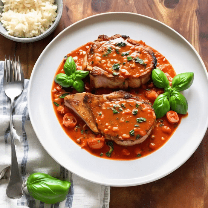 Pork chops in red sauce is a hearty and flavorful dish that brings together tender, juicy pork chops with a rich and savory tomato-based sauce. This comforting recipe features pork chops seared to perfection, then simmered in a sauce made with tomatoes, garlic, onions, and a blend of Italian herbs. The red sauce, infused with the flavors of oregano, basil, and a hint of red pepper flakes, not only keeps the pork chops moist and succulent but also adds a tangy, robust taste that complements the meat beautifully. Serve these pork chops over a bed of pasta, rice, or mashed potatoes, with a side of crusty bread to soak up the delicious sauce, for a satisfying meal that’s perfect for any night of the week.