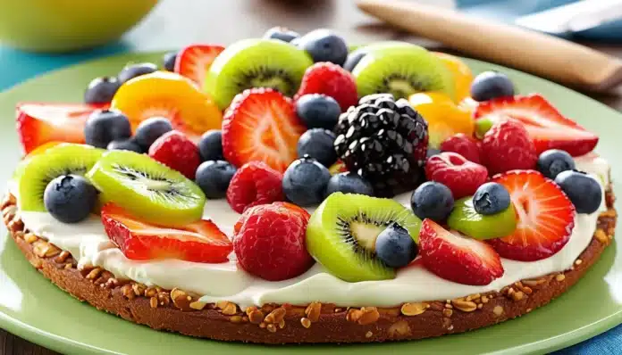 - Add the Fruit Topping: Arrange the sliced strawberries, kiwi, blueberries, and mandarin orange segments over the cream cheese layer in a decorative pattern.