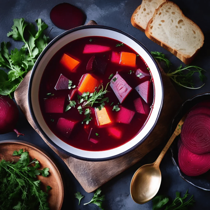 Red Borscht Soup is a traditional Eastern European dish that is both hearty and vibrant, characterized by its deep red color from beets. This flavorful soup combines beets with a variety of vegetables, meat, and a tangy hint of vinegar, creating a perfect balance of sweet and sour flavors. It’s a nutritious and comforting meal, especially enjoyed during the colder months. Red Borscht can be served hot or cold, and is typically garnished with a dollop of sour cream and fresh dill, adding a creamy and aromatic finish to each bowl.