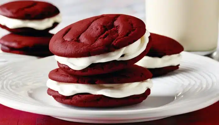 Enjoy your delightful Red Velvet Whoopie Pies, a perfect combination of vibrant red velvet cookies and creamy, tangy filling that will be a hit at any gathering!