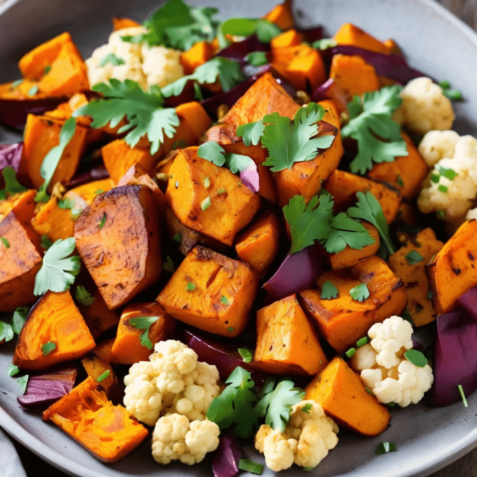 Roasted Curry-Spiced Sweet Potatoes and Cauliflower is a vibrant and flavorful dish that brings together the natural sweetness of roasted sweet potatoes and the nutty taste of cauliflower, all enhanced by a blend of warm, aromatic curry spices. This dish is simple to prepare yet bursting with color and flavor, making it an excellent side for any meal or a satisfying vegetarian main. The roasting process brings out the best in these vegetables, creating a crispy exterior and tender interior, while the curry spices add a delightful kick. Pair it with yogurt or a tangy chutney for an extra layer of taste.