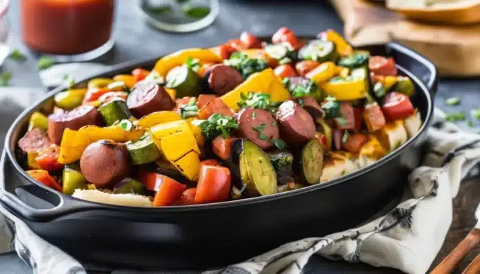 - Combine and serve: Once the vegetables are done roasting, remove them from the oven and add them to the skillet with the hot dogs. Toss everything together until well combined and heated through.