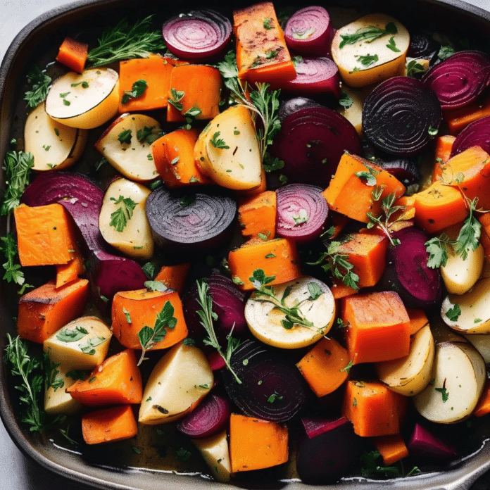 - In a large bowl, toss the carrots, parsnips, sweet potato, beets, and onion with olive oil, garlic, thyme, rosemary, salt, and pepper until well coated.