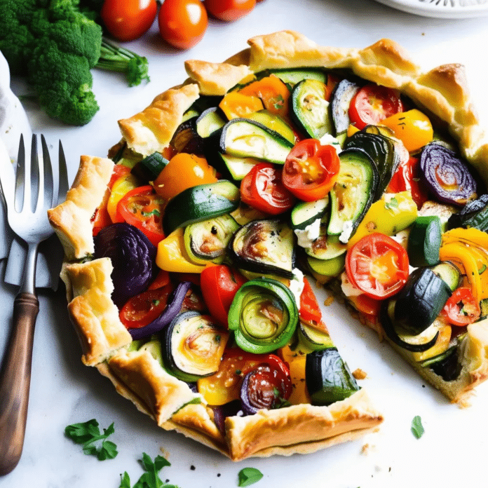 - Roll out the chilled dough on a lightly floured surface to form a large circle. Transfer the dough to a parchment-lined baking sheet. Spread the ricotta or goat cheese over the dough, leaving a border around the edges. Arrange the roasted vegetables on top. Fold the edges of the dough over the filling, pleating as needed.
