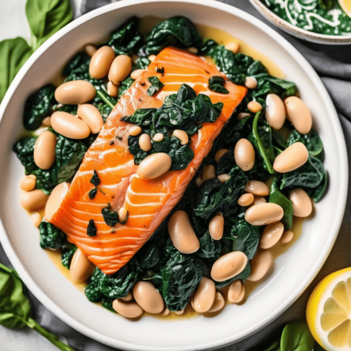 Enjoy this delicious and wholesome Salmon with Spinach & White Beans for a nutritious, flavorful meal!