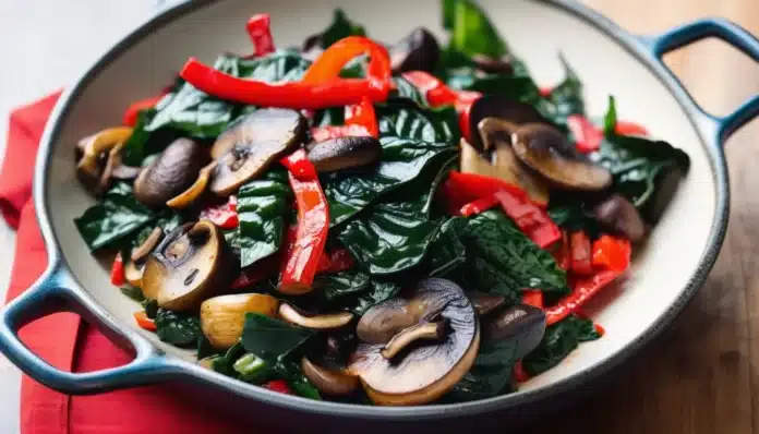 - Serve: Transfer the sautéed Swiss chard with mushrooms and roasted red peppers to a serving dish. Serve warm as a side dish or light main course.