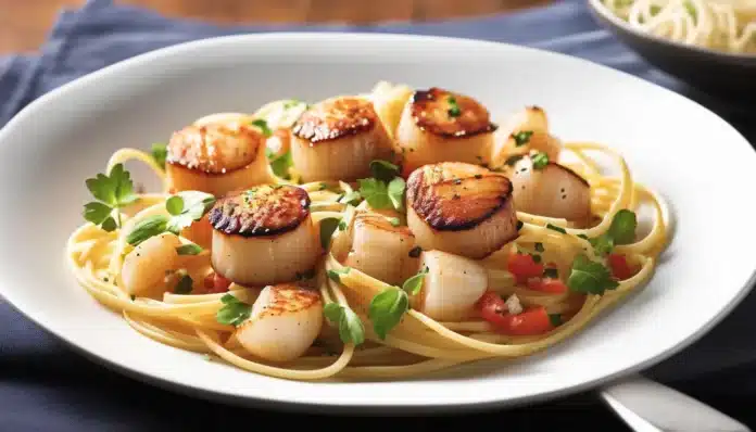 - Return the scallops to the skillet, gently tossing them with the pasta to warm through. Remove from heat and garnish with fresh parsley and lemon zest.
