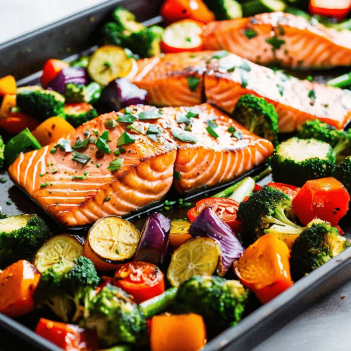 Sheet Pan Salmon and Veggies is a healthy and delicious one-pan meal that is perfect for busy weeknights. This simple recipe features tender, flaky salmon fillets paired with a colorful assortment of roasted vegetables, all seasoned to perfection and baked together on a single sheet pan. The vegetables caramelize beautifully while the salmon cooks to juicy perfection, making this dish both nutritious and flavorful. Easy to prepare and clean up, this sheet pan meal is a convenient way to enjoy a balanced dinner with minimal effort.