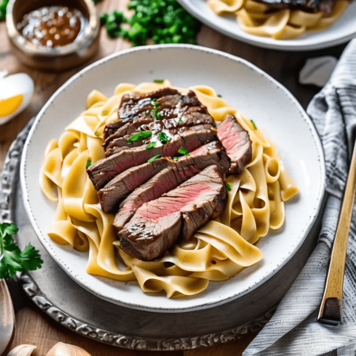 - While the sirloin is simmering, cook the egg noodles according to package instructions. Drain and set aside.