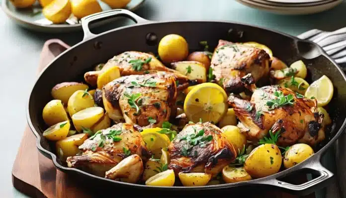 Skillet-Roasted Lemon Chicken with Potatoes is a flavorful and comforting dish that brings together juicy, tender chicken with crispy, golden potatoes, all infused with the bright and tangy flavor of lemon. This one-pan meal is perfect for weeknight dinners or casual gatherings, offering a delightful combination of savory and citrusy notes that will satisfy any palate. The chicken is seared to perfection and then roasted alongside the potatoes, allowing the flavors to meld beautifully as they cook together. Finished with a sprinkle of fresh herbs, this dish is not only delicious but also easy to prepare, making it a go-to recipe for a simple yet impressive meal.