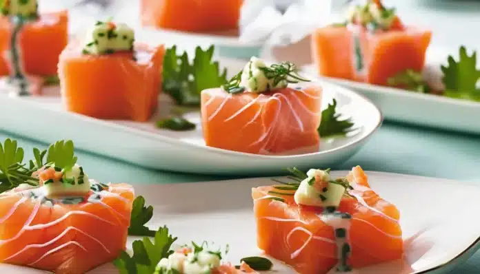 5. Garnish and Serve: Sprinkle the smoked salmon bites with fresh dill, capers, and a bit of lemon zest for garnish. Arrange on a serving platter and serve immediately.