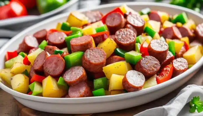 - Prepare the ingredients: In a large mixing bowl, combine the sliced smoked sausage, diced potatoes, bell peppers, and chopped onion.