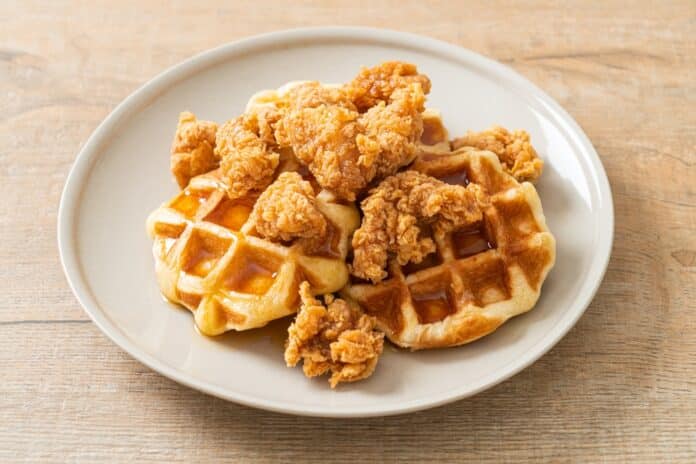 - Plate the waffles and top with a piece of fried chicken.