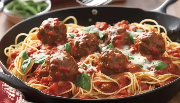 - Simmer the Dish: Return the meatballs to the skillet, nestling them into the sauce and pasta. Cover the skillet and simmer on low heat for 12-15 minutes, or until the spaghetti is tender and the meatballs are cooked through. Stir occasionally to prevent sticking.