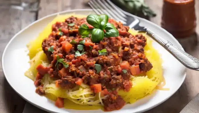 - Divide the spaghetti squash strands among plates and top with the meat sauce.
