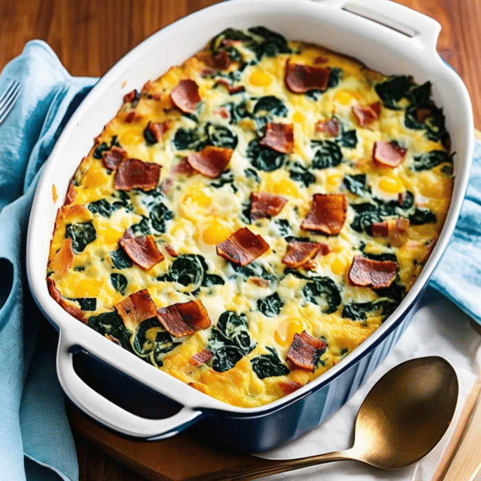 Spinach Bacon Egg Casserole is a hearty and flavorful dish that’s perfect for breakfast or brunch, offering a satisfying combination of savory bacon, fresh spinach, and fluffy eggs. It’s easy to make and sure to please any crowd!