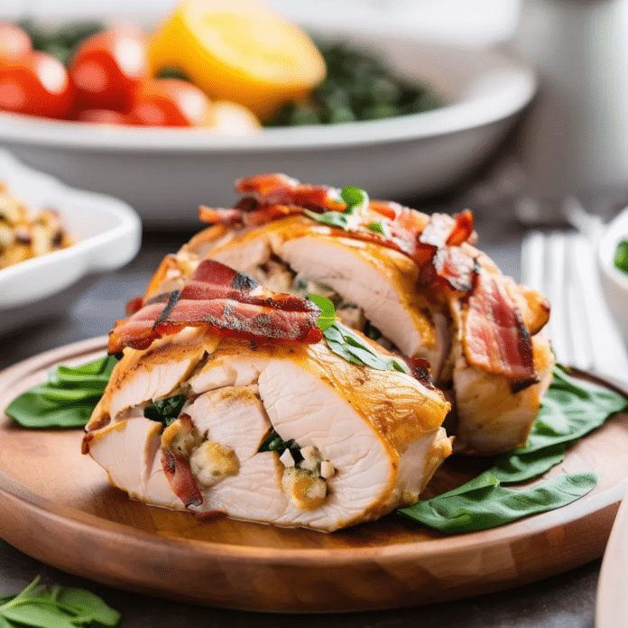 Stuffed chicken breast wrapped in bacon is a flavorful and elegant dish that’s sure to impress. This recipe features juicy chicken breasts filled with a creamy and savory stuffing, then wrapped in smoky, crispy bacon. The stuffing can be customized with ingredients like spinach, cheese, and herbs, making each bite bursting with delicious flavors. As the bacon crisps up in the oven, it keeps the chicken moist and infuses it with a rich, smoky taste. Perfect for a special dinner or entertaining guests, this dish is easy to prepare but looks and tastes gourmet. Serve it with roasted vegetables, a fresh salad, or mashed potatoes for a complete meal that everyone will love.