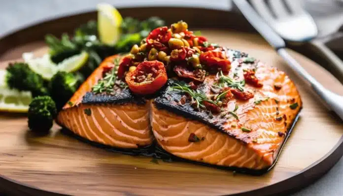 Enjoy this flavorful and aromatic Sun-Dried Tomato Cedar Plank Salmon with your favorite side dishes for a complete meal!