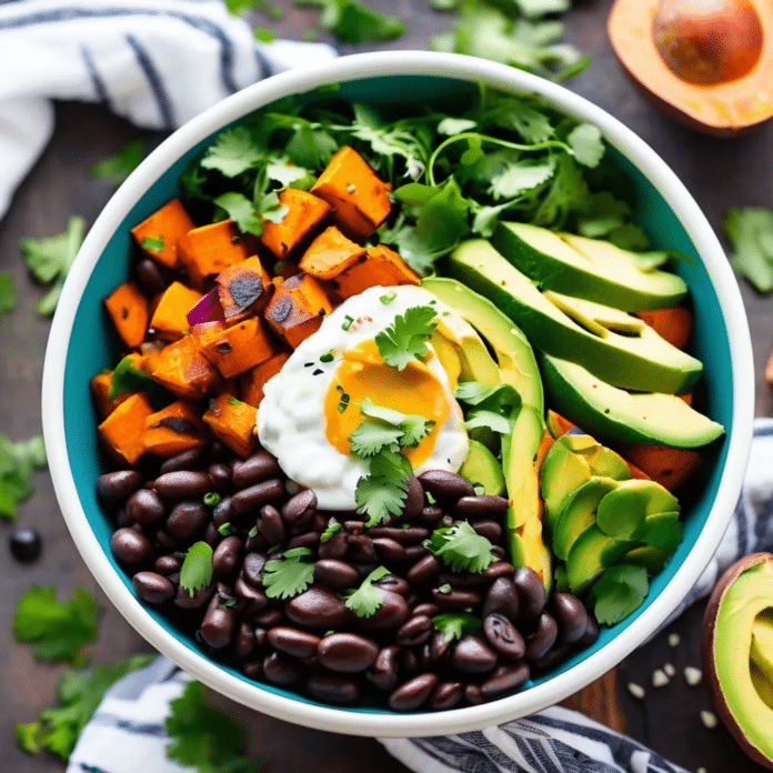 - Assemble the bowl: In individual bowls, layer the cooked quinoa or brown rice as the base. Top with roasted sweet potatoes, black beans, avocado slices, cherry tomatoes, red onion, and chopped cilantro.
