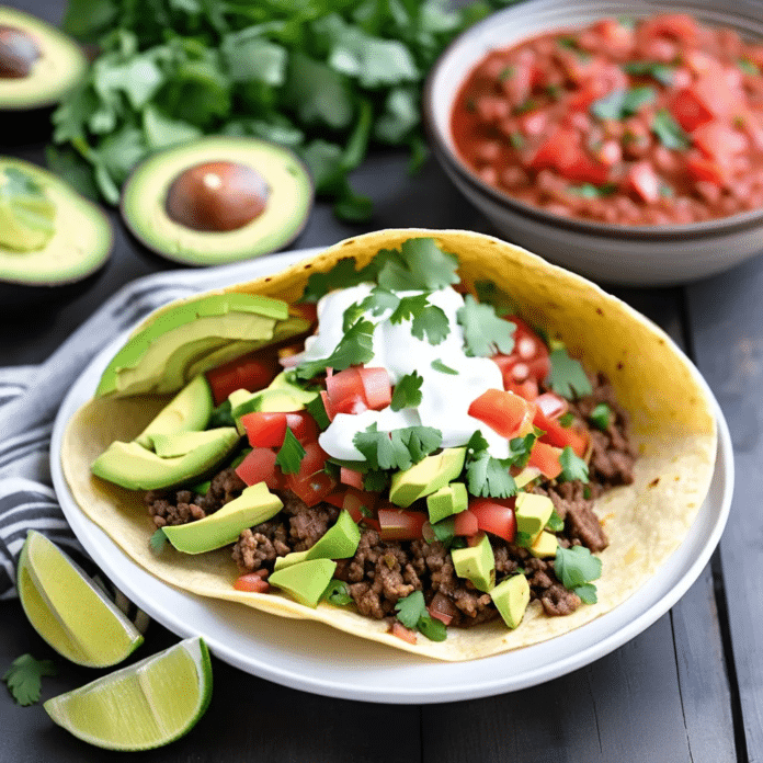 • In serving bowls, layer a base of cooked rice or cauliflower rice (if using), followed by a generous scoop of the seasoned ground beef. Top with shredded lettuce, diced tomatoes, shredded cheese, sliced avocado, sour cream, and salsa.