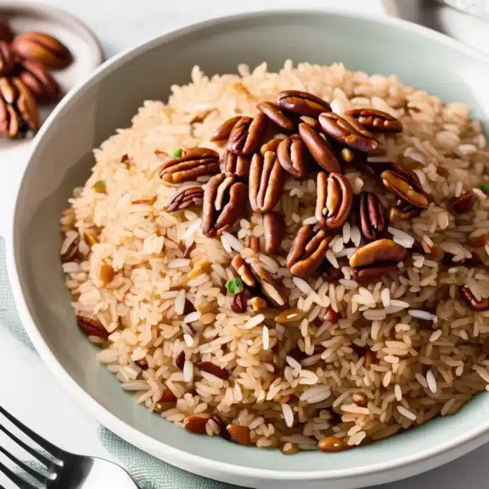 - Once the rice is cooked, fluff it with a fork and stir in the toasted pecans.