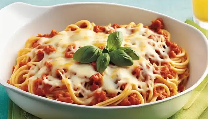 - Remove the dish from the oven and let it cool slightly. Garnish with fresh basil if desired, and serve the Three-Cheese Spaghetti Bake warm.