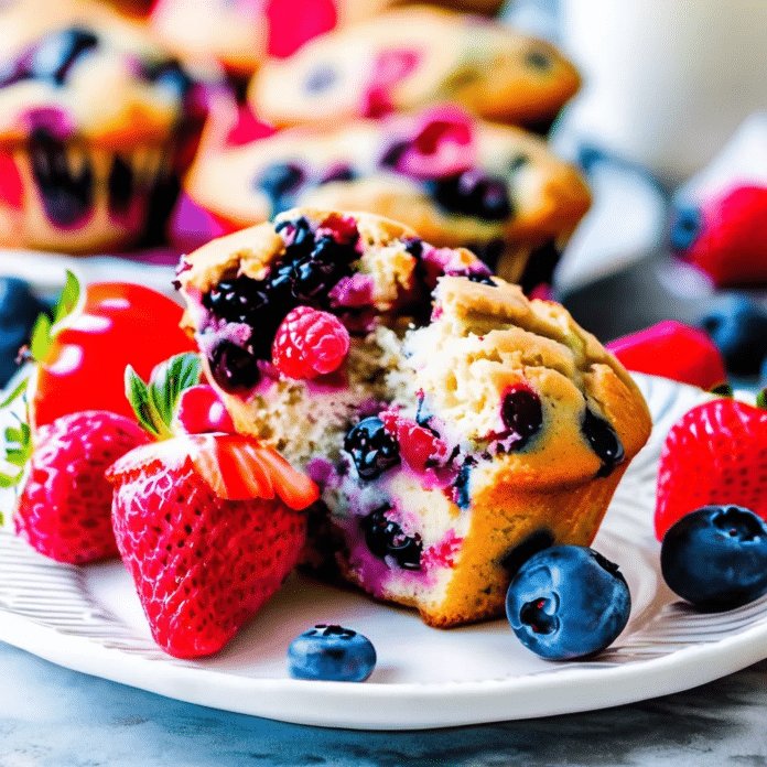 Triple Berry Muffins are a delightful and colorful treat, bursting with the sweet and tangy flavors of fresh berries. These moist, tender muffins combine blueberries, raspberries, and strawberries, making them a perfect breakfast or snack option that feels both indulgent and wholesome. The mix of berries creates a beautiful balance of flavors and adds a vibrant pop of color to every bite. Whether you enjoy them warm from the oven or as a grab-and-go treat, these muffins are sure to brighten your day and satisfy your cravings for something fruity and delicious.