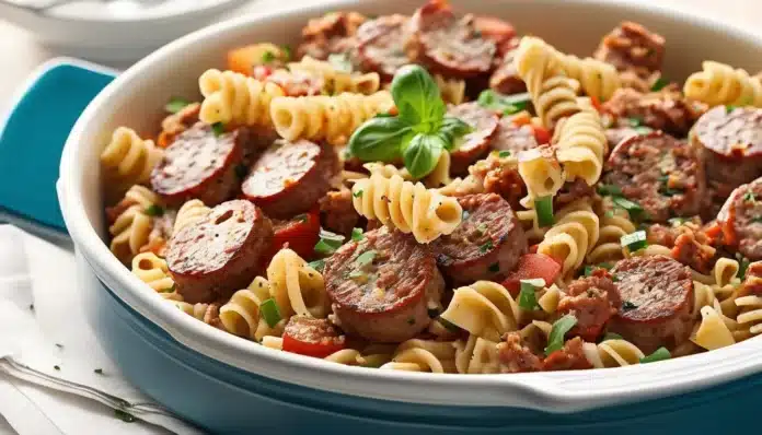 - Add the cooked pasta to the sausage and vegetable mixture, tossing to coat everything evenly.