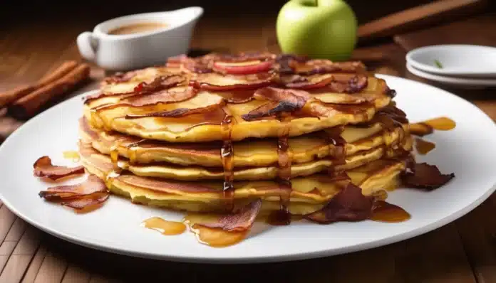 - Flip and serve: Carefully flip the pancake onto a large plate, apple and bacon side up. Let it cool for a minute before slicing and serving.