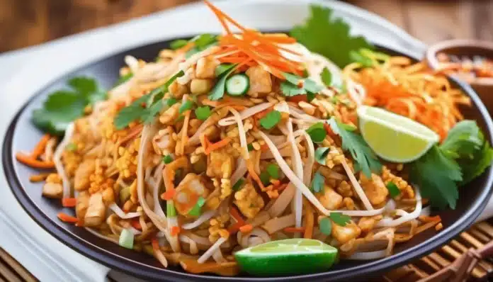 - Serve: Divide the Pad Thai onto plates and top with bean sprouts, crushed peanuts, fresh cilantro, and lime wedges for garnish.